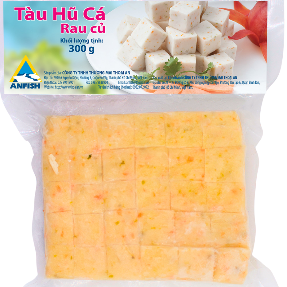 Tàu hũ cá rau củ Thoại An được sản xuất từ nguyên liệu chọn lọc, có độ dai tự nhiên từ thịt cá, được trộn cùng với rau củ tạo ra hương vị mới lạ cho khẩu phần ăn thêm đậm đà.